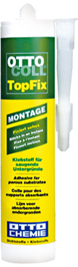 Ottocoll TopFix не подходит для приклеивания зеркал и стекла, полиэтилена, полипропилена, полиамида, тефлона, силикона, акрилового стекла, воскообразных, битумных или маслосодержащих изделий. Ottocoll TopFix может привести к возникновению коррозии при контакте с цветными металлами и металлами, не защищенными от коррозии.